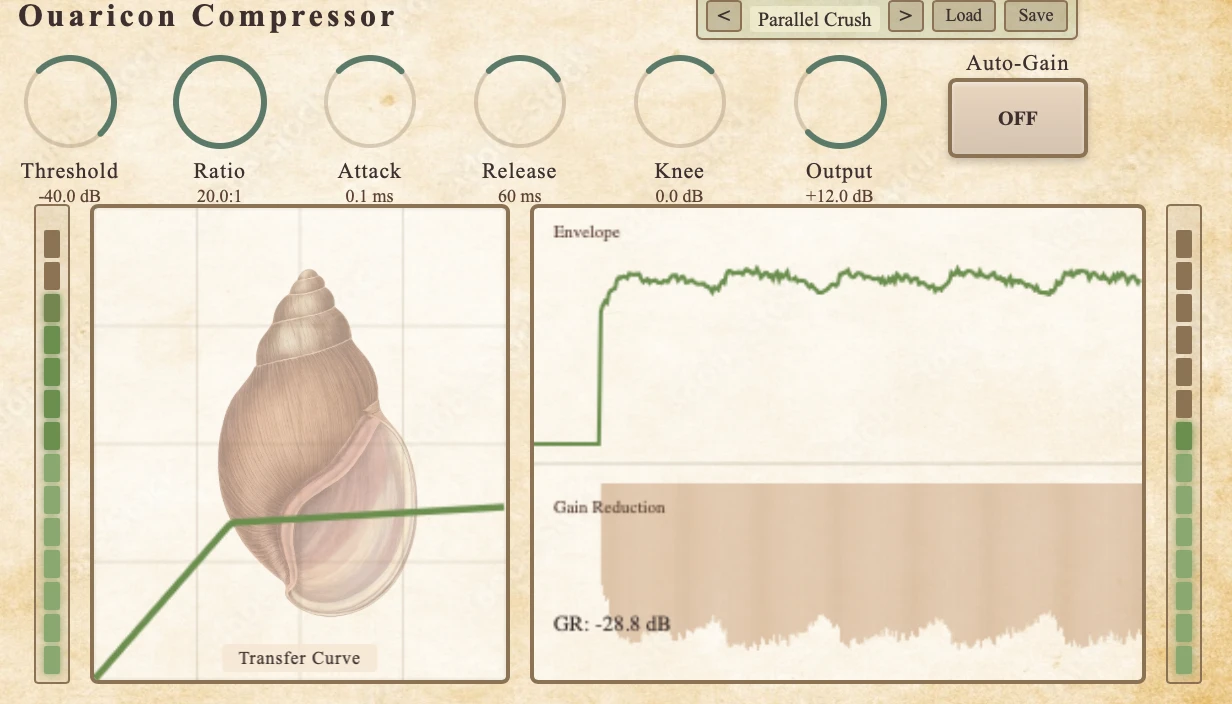 Ouaricon Compressor is a versatile dynamics processor designed for musical compression across any source material. From gentle leveling to aggressive pumping, it delivers transparent control with character.